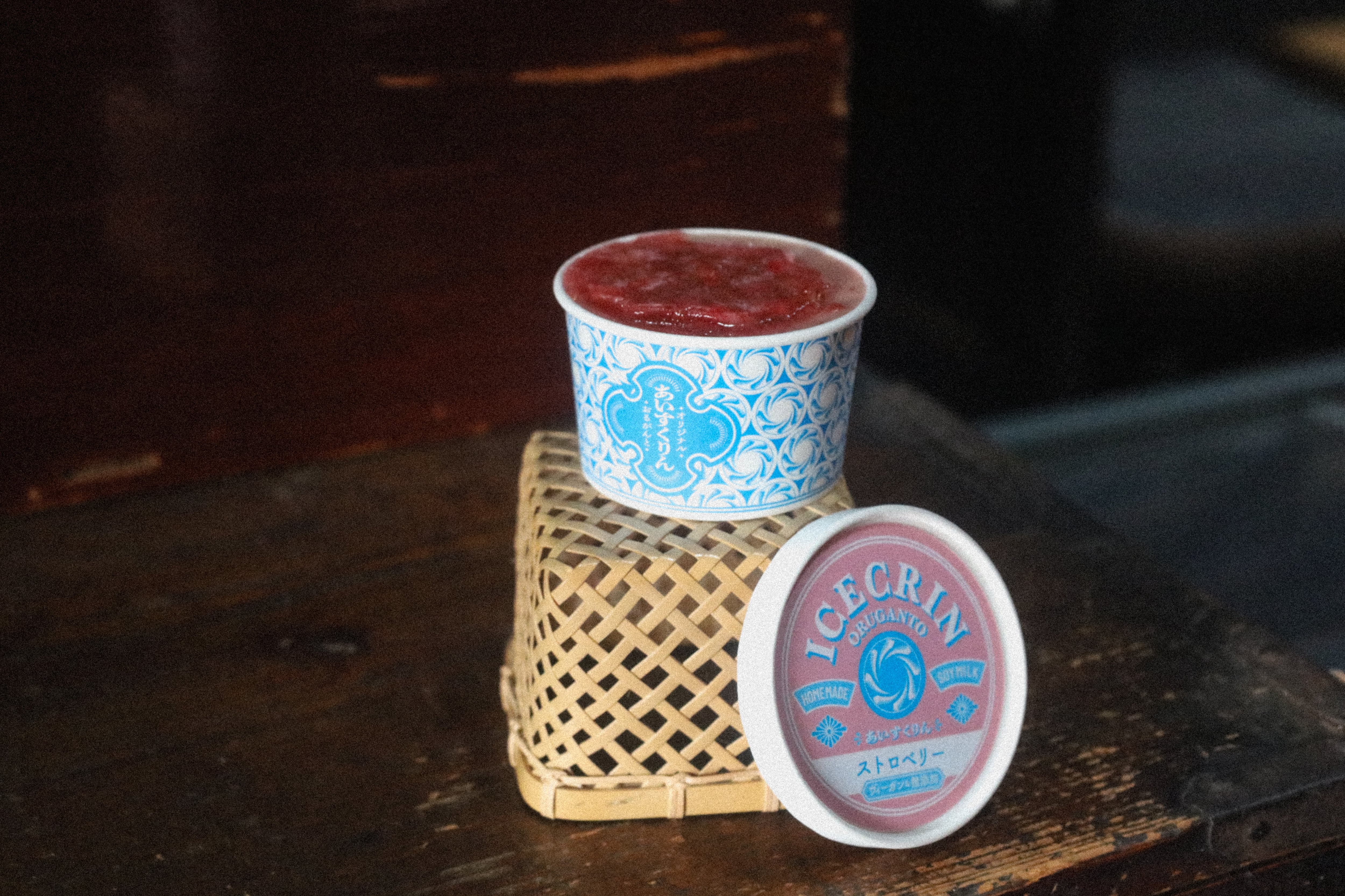 苺は熊本県八代、山下苺農園さんのゆうべにを使用。有機豆乳を滑らかな口当たりにするためにがりを入れてクリーム状にし、甘味は喜界島のきび糖、あいすくりんらしい食感を出すため乳化安定剤の代わりに風味の少ないココナッツオイル。上からは食感も楽しめるよう苺のコンフィチュールをトッピング。1つ1つ丁寧にカッピングしたアイスは乳アレルギーの方から小さなお子さんや人生の大先輩方まで幅広くお楽しみいただけるよう完全無添加のヴィーガン仕様に仕上げました。